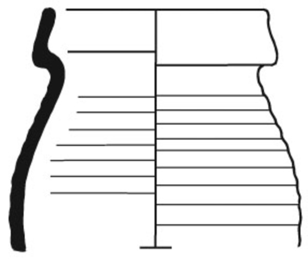 (lage) bolle handgevormde kan met vloeiende overgang naar gedraaide cilindrische tot licht conische hals met rechte rand, standring