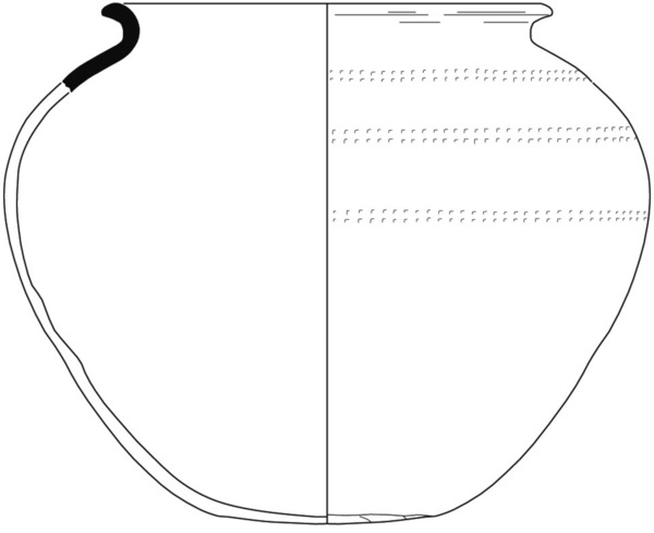 bolle handgevormde grape met gedraaide rand en (verdikte) afgeronde rand met dekselgeul