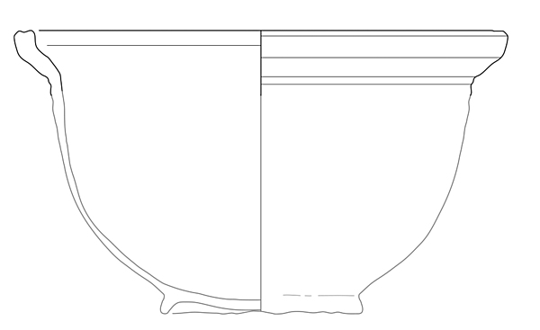 (lage) bolle handgevormde kan met vloeiende overgang naar gedraaide cilindrische tot licht conische hals met rechte rand, standring