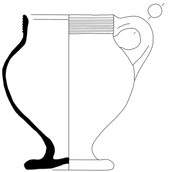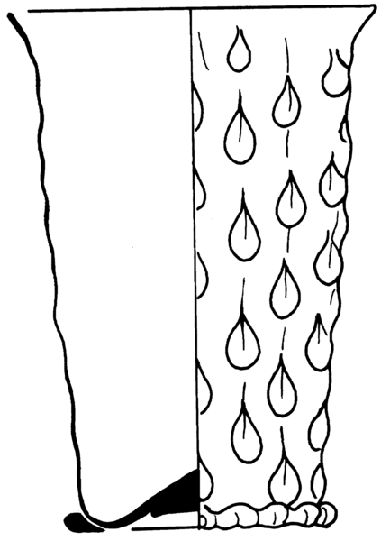 cilindrische (a), conische (b) of getailleerde (c) beker met verticaal of naar rechts- of links draaiend ribbelpatroon, opgestoken bodem met pontilmerk