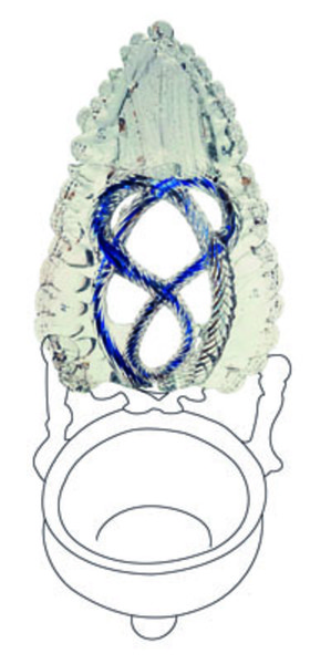 komvormig wijwatervat met een achterzijde bestaand uit een 8-vormige versiering van gewonden en geknepen draden