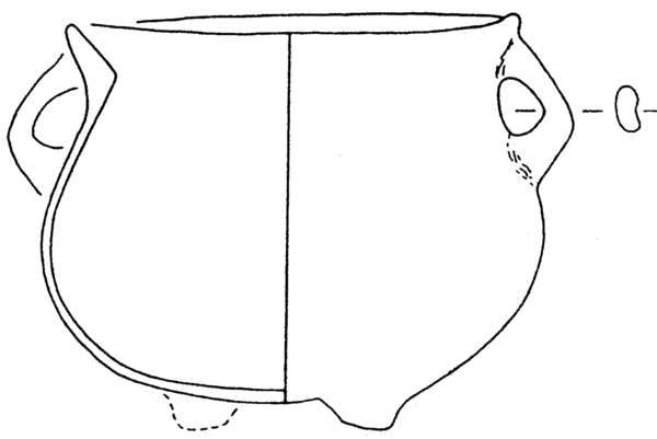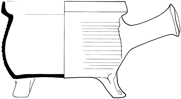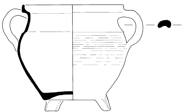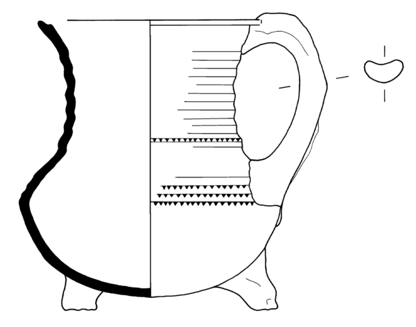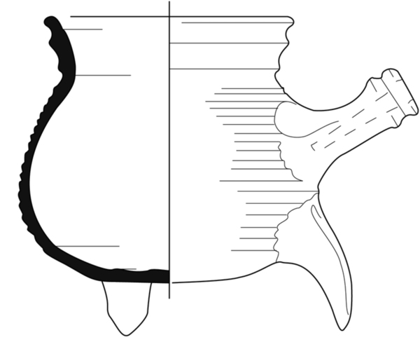 vrijwel cilindrische grape met knik bodem-wand, uitgebogen rand met spitse lip, bolle bodem met poten