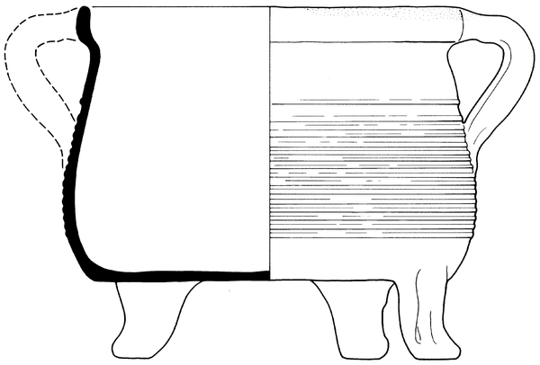 bolle grape met uitgebogen aan buitenzijde afgeplatte rand, ribben op buik, bolle bodem met poten