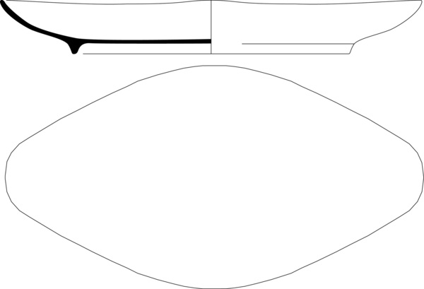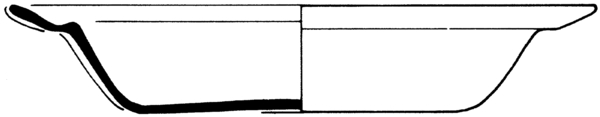 vlakke, ovale tot rechthoekige schaal met accoladevormige rand, schuin uitstaande wand/rand, scherpe knik op overgang van wand naar smalle vlag, standvlak
