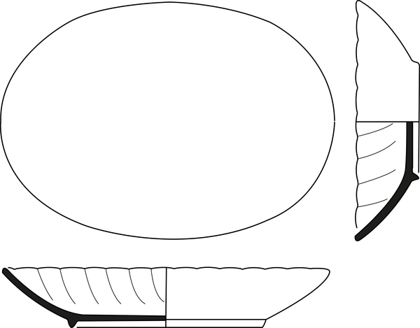 lage, ovale schaal , naar buiten geknikte brede vlag met horizontaal gegolfde rand, standvlak