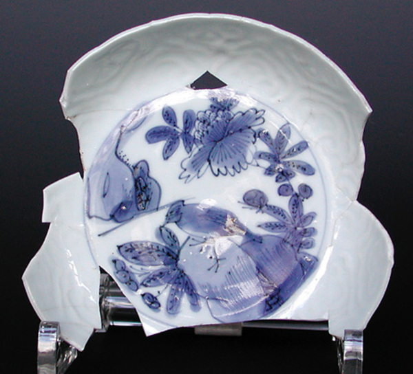 | 5c | golfrand, spiegel: vogel op rots, vlag: ingedrukt reliëf met ruï-motief onderglazuur blauw |