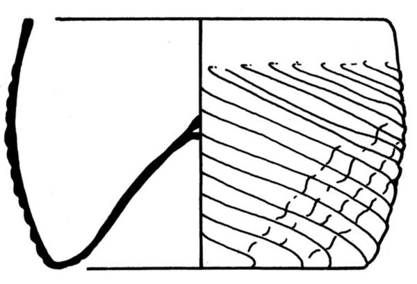 | 4b vorm | cilindrische beker met gekruist ribbelpatroon, opgestoken bodem met pontilmerk |