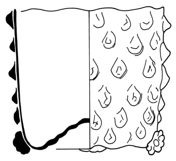 | 4b | cilindrische beker met knobbelpatroon of combinatie knobbel-netwerkpatroon, opgestoken bodem met pontilmerk, met noppootjes |