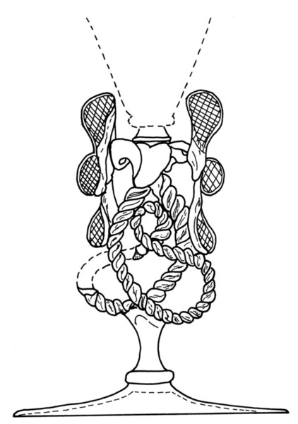 | 4b | trechtervormig kelkglas met of zonder afgeronde bodem, met uit getordeerde draden opgebouwde stam in een dubbele lus, ook met een achtvorm en met vleugels, schijfvormige voet met pontilmerk |