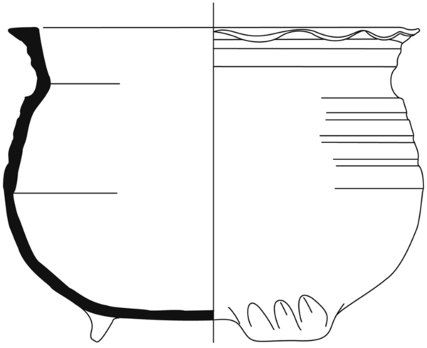 | 4b | wijdmondige biconische kom met afgeronde buikknik, ribbel op overgang van schouder naar rand, gelobde kraagrand, lobvoeten |