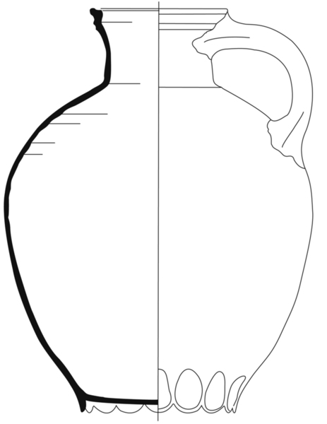 | 4b | peervormige kan met hoge schouder en cilindrische hals met verdikte, naar binnen afgeschuinde platte rand (manchetrand), lobvoeten |