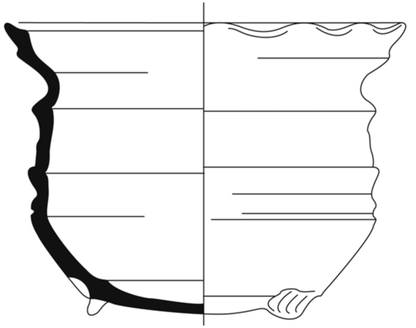 | 4b | wijdmondige biconische kom met afgeronde buikknik, ribbel op overgang van schouder naar rand, gelobde kraagrand, lobvoeten |