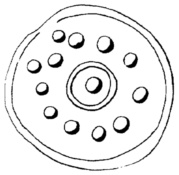 | 5c | uitwendig: drie appliques: rond medaillon met concentrische cirkels van punten |