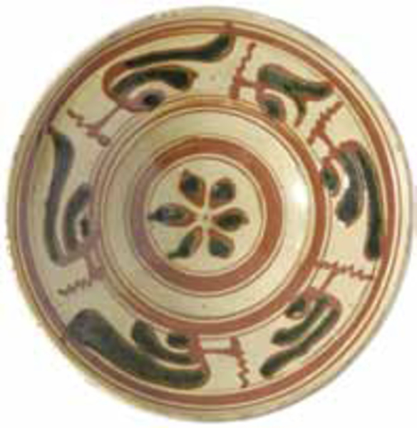 | 5c | met slibversiering decoratie in groen en bruin op gele ondergrond |