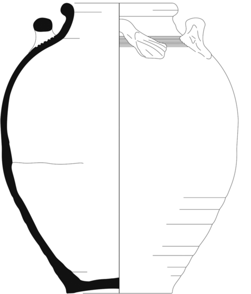 | 4b | martavaan of voorraadpot met hoge schouder en verdikte, afgeronde rand, diverse oren op schouder, standvlak |