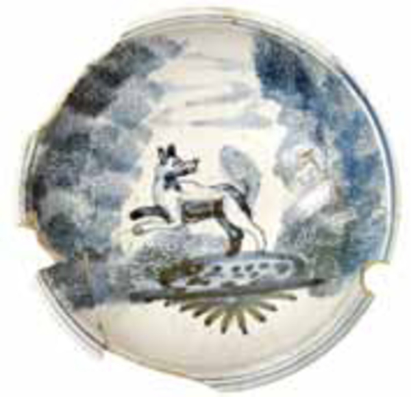 | 5c decoratie | beschildering in blauw: springende hond/vos/wolf inwendig: blauw |