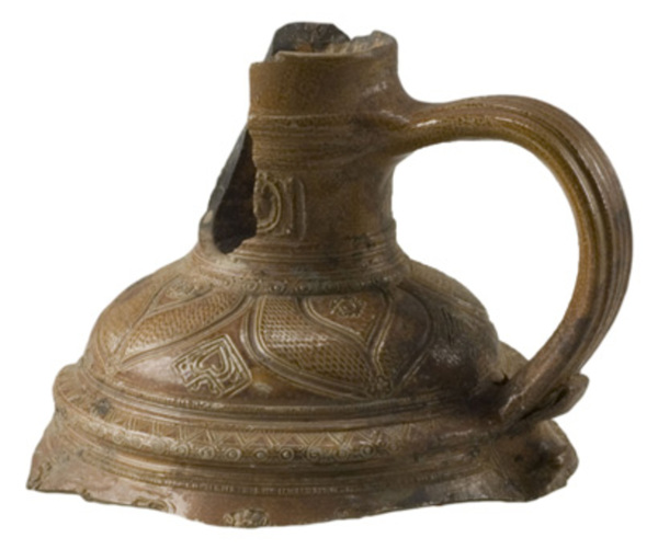 | 5c decoratie | uitw; gezichtsapplique, stempel en gutswerk krul bij ooraanzet |
