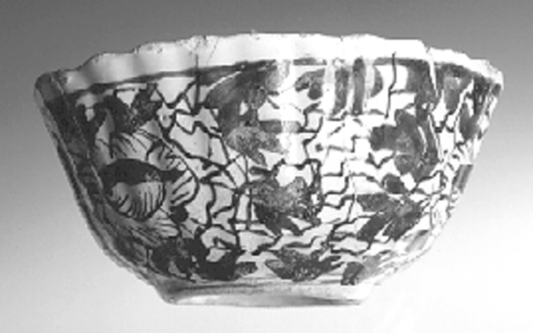 | 5c decoratie | uitwendig: bloemmotieven in blauw, geplooid uitwendig: blauw |