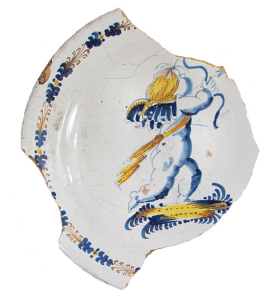 | 5c decoratie | blauw, geel en bruin, spiegel: cupido met pijl en boog inwendig: polychroom |