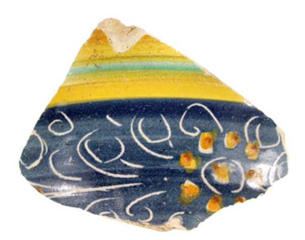 | 5c | blauw, geel en oranje, op buitenzijde: deels geschilderde en deels ingekraste florale motieven inwendig: polychroom |