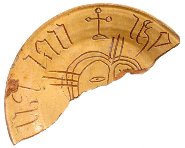 | 5c decoratie | inwendig sliblaag met ingekraste decoratie: op spiegel: Christuskop, op vlag: (MARIA) (AN)NA JAN IHE(SUS) EN KRUIS |