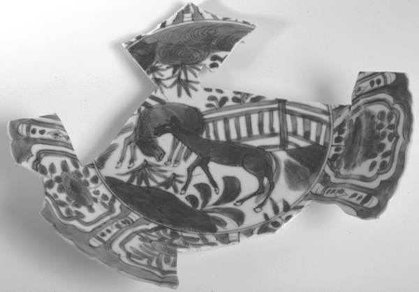 | 5c | vlag: binnenzijde: afwisselend brede panelen (8) met perzikbloemmotief en smalle panelen met kralensnoer; buitenzijde: panelen met parelmotief omgeven door stippen; spiegel: twee paarden in landschap blauw |