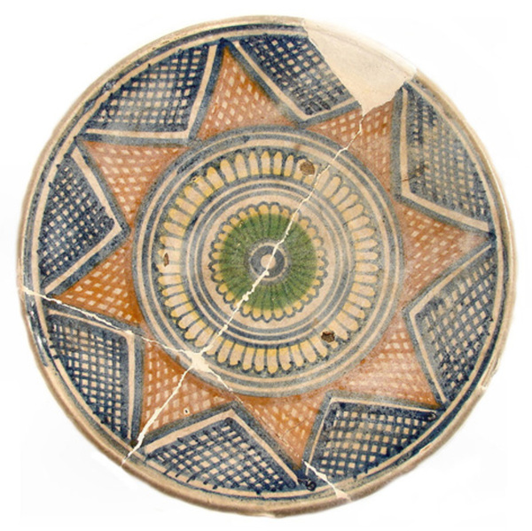 | 5c decoratie | beschildering in blauw, geel, groen en oker, spiegel: rozet inwendig: polychroom |
