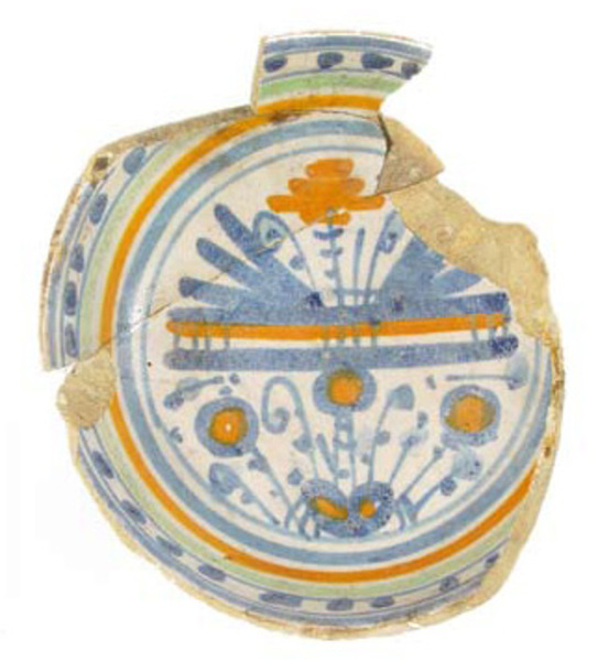 | 5c decoratie | beschildering in blauw, oranje en groen inwendig: polychroom |