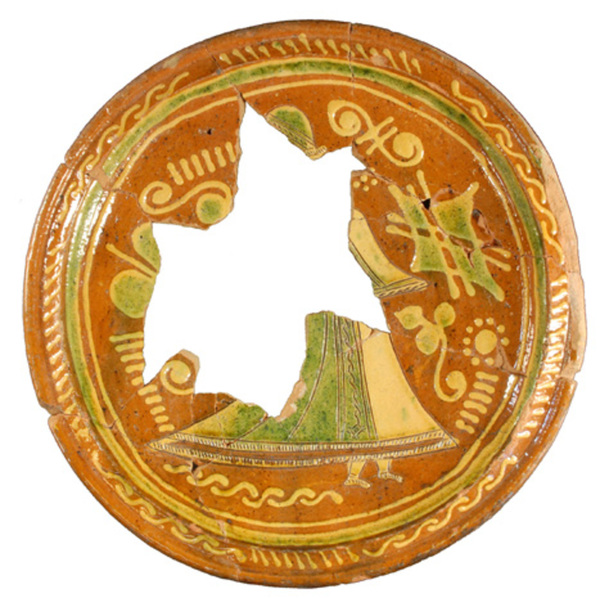 | 5c decoratie | slibdecoratie in ringeloor en sgraffito, met accenten groen, vrouwenfiguur |