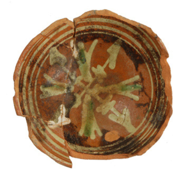 | 5c decoratie | decor van slib, pijlen en concentrische cirkels, accenten groen |