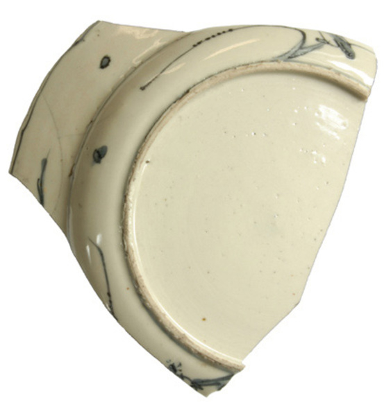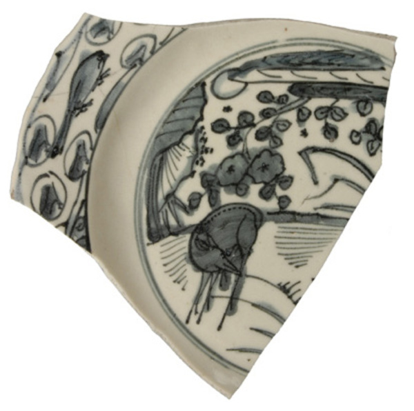 | 5c | blauwe beschildering, spiegel: herten in landschap; vlag: vogel en parels; achterzijde: takken onderglazuur blauw |