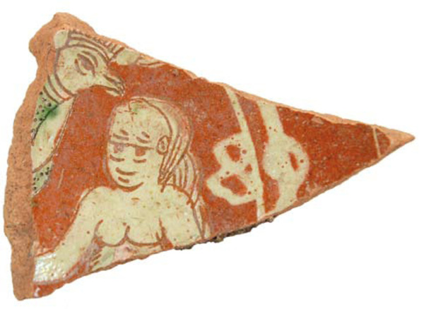 | 5c decoratie | decoratie in slib: Adam en Eva met boom en slang (zondeval), jaartal (..89) |