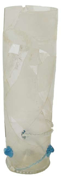 | 4b | cilindrische beker met horizontale draad rondom en daaronder drie of vier golvende diagonale draden in een klauwtje eindigend, opgestoken bodem met pontilmerk, braamnoppootjes |