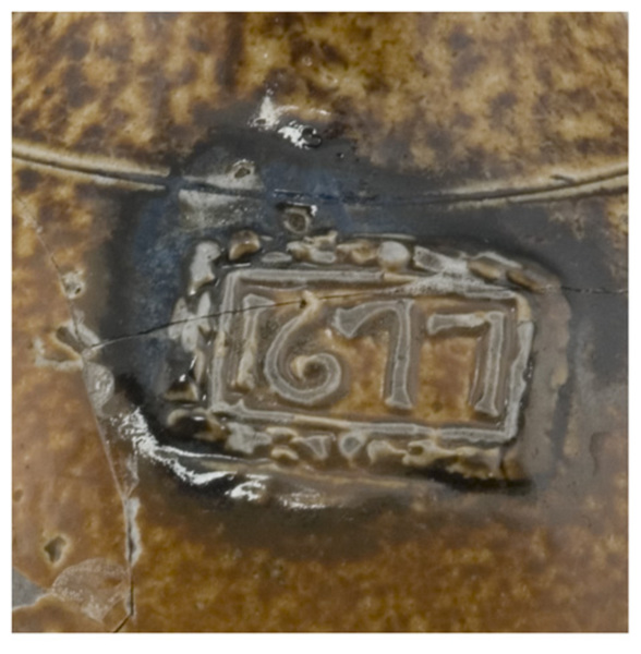 | 5c decoratie | band kobaltblauw om hals, stempelindruk boven buik '1677' blauw |