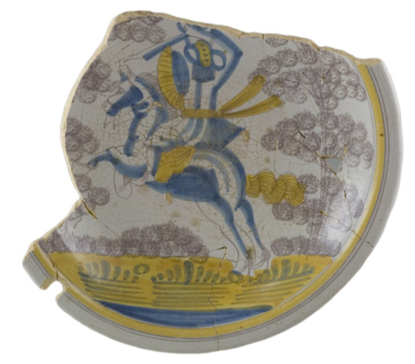 | 5c decoratie | strijder te paard in blauw, geel en paars inwendig: polychroom |
