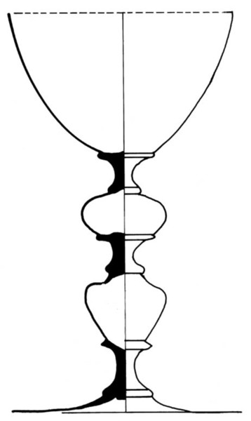 | 4b | komvormig kelkglas met dubbele nodus of balusterstam, schijfvormige voet met pontilmerk |