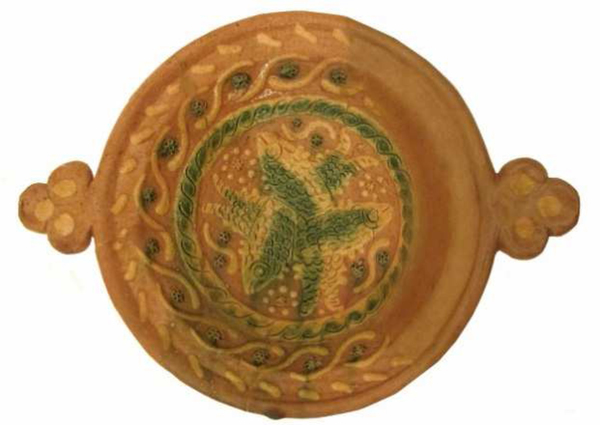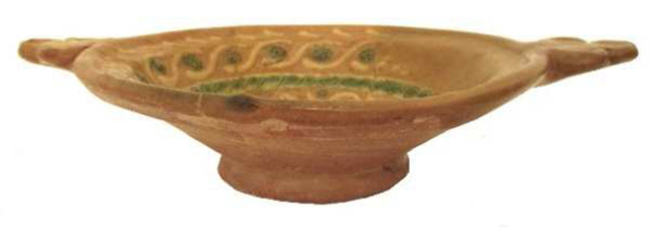 | 5c | gele en groene ringeloor en sgraffito: drie elkaar kruisende vissen met S-stippen motieven en stippelrozetten, binnen golfband; S-stippen-band en streepjesrand bladvormig nokoor |