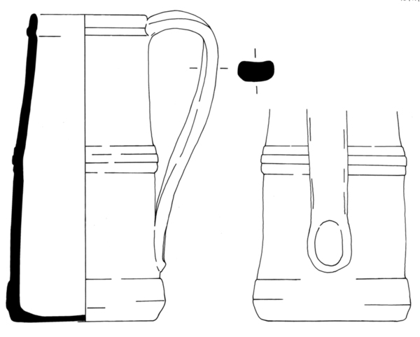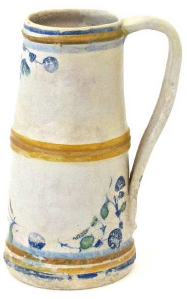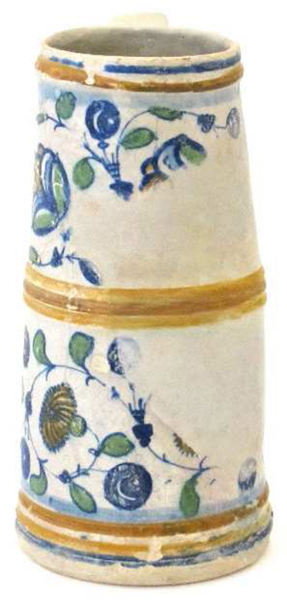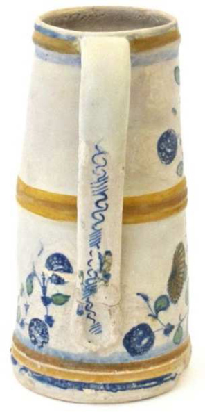 | 5c | decoratie in blauw, geel en groen: geelblauw beschilderde ribbelbanden aan boven- en onderzijde en gele ribbelband halverwege, bladranken met gele granaatappels en anjers met blauwe bessen; blauwe slingers buiten op oor inwendig: polychroom duimindruk bij ooraanzet |