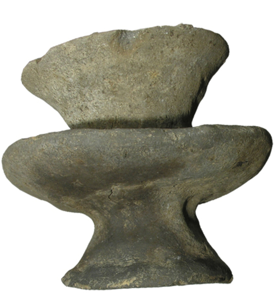| 4b | primitieve handgevormde olielamp met holle steel en twee schalen |