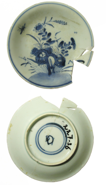 | 5c decoratie | floraal motief, Kangxi periode (1672-1722) onderglazuur blauw |