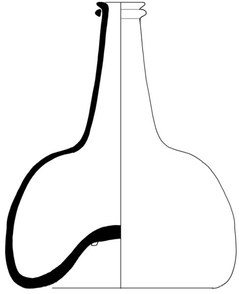 | 4b | bolvormige wijnfles met licht conische buik, grootste breedte aan de basis, opgestoken bodem met pontilmerk |