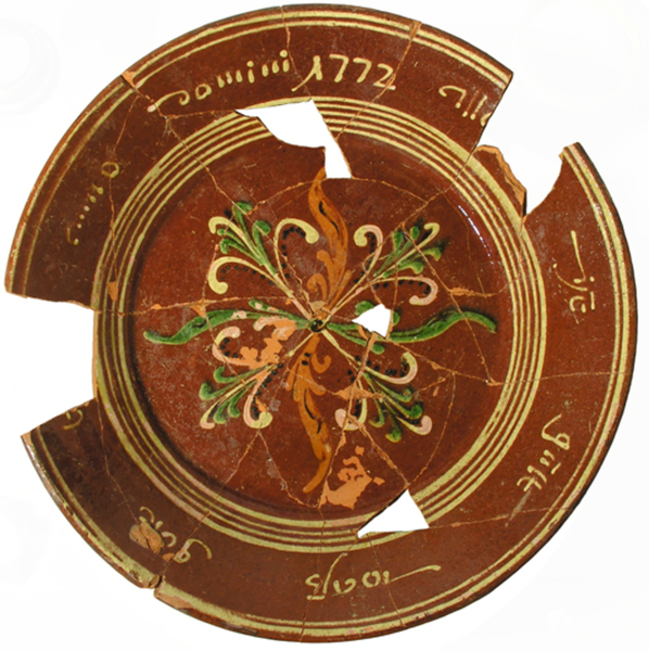| 5c decoratie | slibversiering: bloemrozet binnen concentrische cirkels op spiegel en tekst en jaartal 1772 op wand |