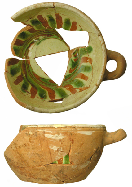 | 5c decoratie | slibversiering: inwendig witte sliblaag met daarop gestileerde lauwerkrans |