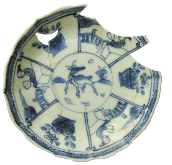 | 5c | centraal een hert in een landschap met daaromheen vakken met afwisselend een bloempot en Chinezen in een landschap onderglazuur blauw |