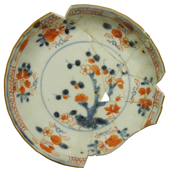 | 5c | landschap met struik, uitwendig bruin (kapucijnergoed) Chinees Imari palette; Kangxi-periode onderglazuur blauw, bovenglazuur rood en goud, uitwendig bruin |