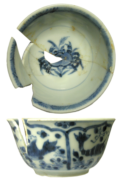 | 5c | inwendig een bloemmotief uitwendig vakken met vissen tussen waterplanten onderglazuur blauw |