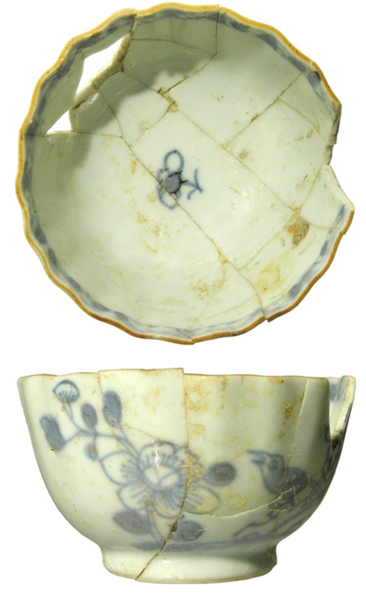 | 5c | inwendig sterk gestileerd bloemmotief uitwendig vogel en bloemen onderglazuur blauw |