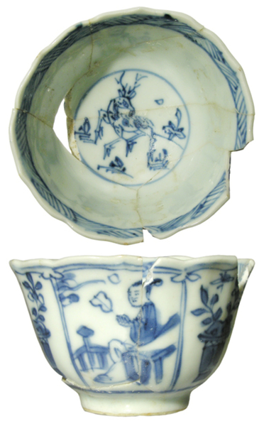 | 5c decoratie | inwendig een hert in landschap uitwendig vakken met afwisselend een bloempot en Chinezen in een landschap onderglazuur blauw |