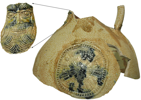 | 5c | appliques (baardmanmasker en driemaal bloemrozet) met kobaltblauwe vlekken |