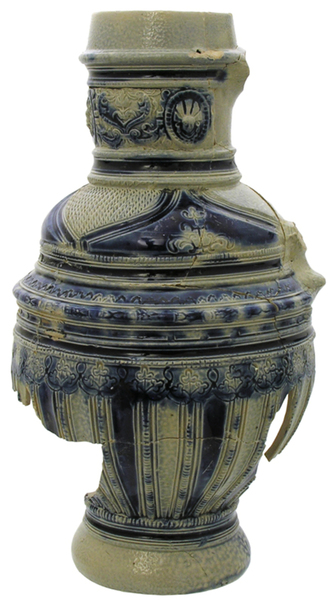 | 5c | snij- en stempelwerk, op hals applique met ornamentale decoratie en gestileerde portretbustes, gecombineerd met kobaltblauw glazuur blauw krul bij ooraanzet |